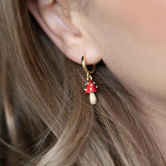These magical mushroom charm hangs elegantly from lobe-hugging hoop earrings. A miniature masterpiece, meticulously hand-crafted, our mushroom charm adorned with delicate faux pearls, suspends gently from a dainty chain. Mushrooms are often linked to mysticism and magic, connecting their wearer to nature's mysteries and unseen wonders.