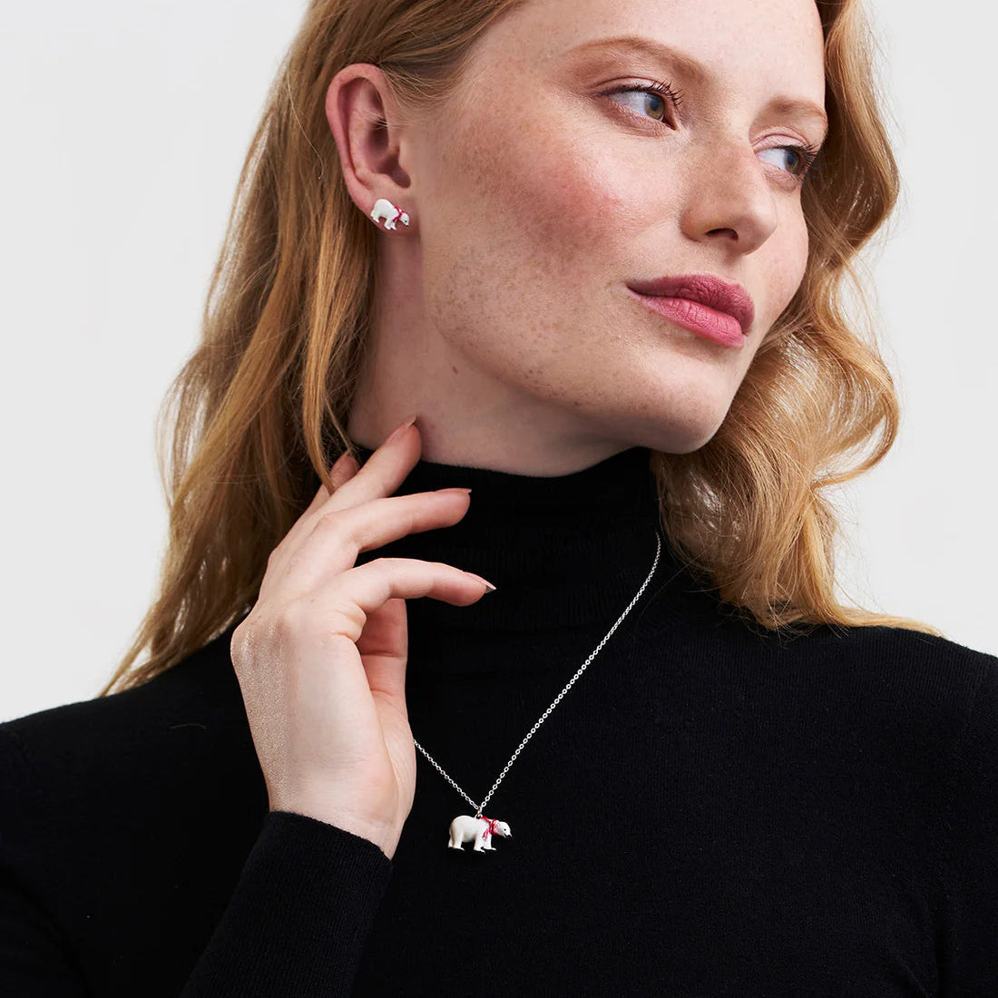 The Cosy Polar Bear Pendant Necklace features a charming hand-painted enamel polar bear wrapped in a red scarf, celebrating the spirit of the winter solstice. Crafted from sterling silver-plated brass, this silver-tone necklace is a playful yet elegant addition to your seasonal jewellery collection. A perfect gift for winter, adding a touch of festive whimsy to your everyday look.