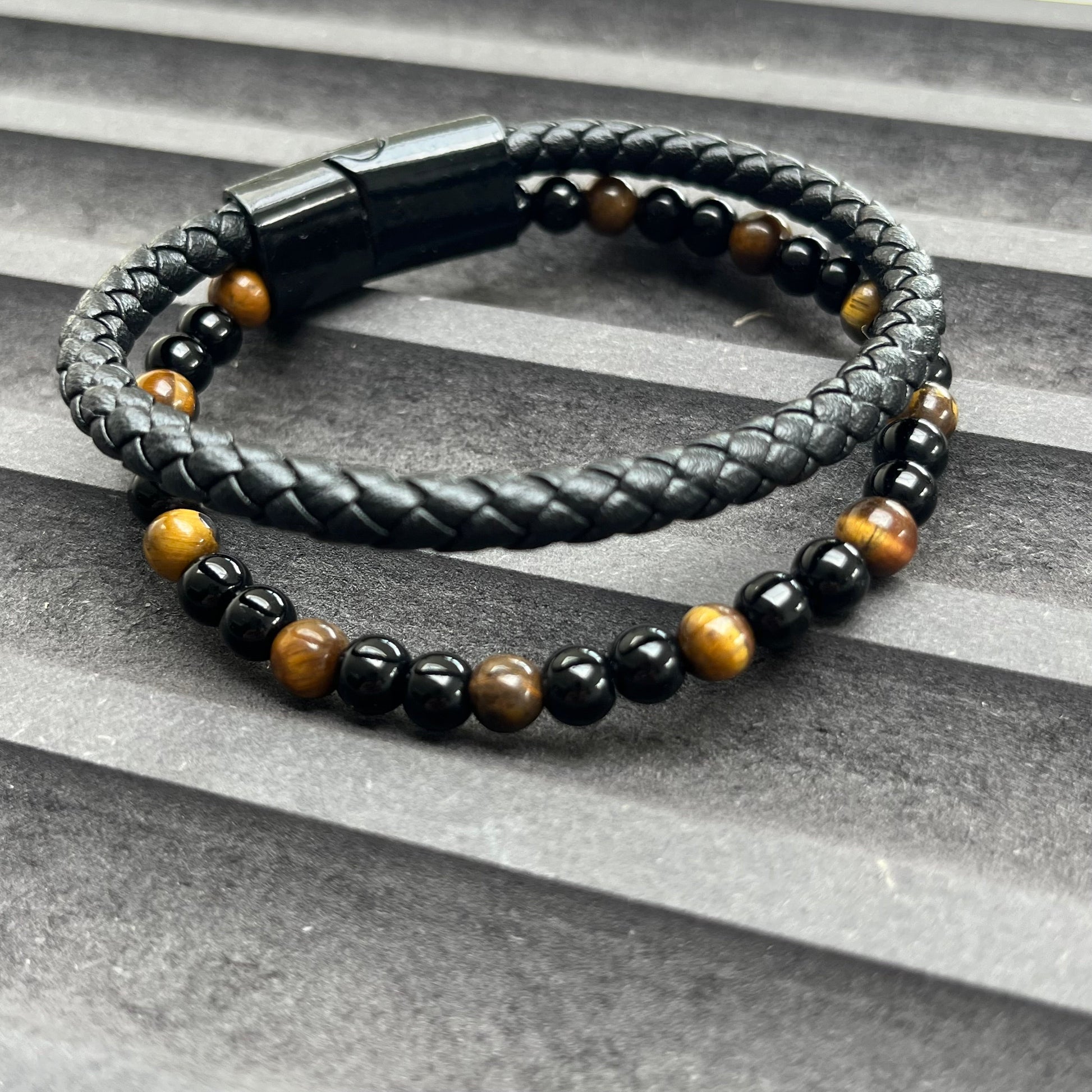 Elevate your style with the Jaipur Bracelet - Tiger, featuring a double-banded leather strap paired with a secondary beaded strap adorned with stunning mixed-colour tiger beads.