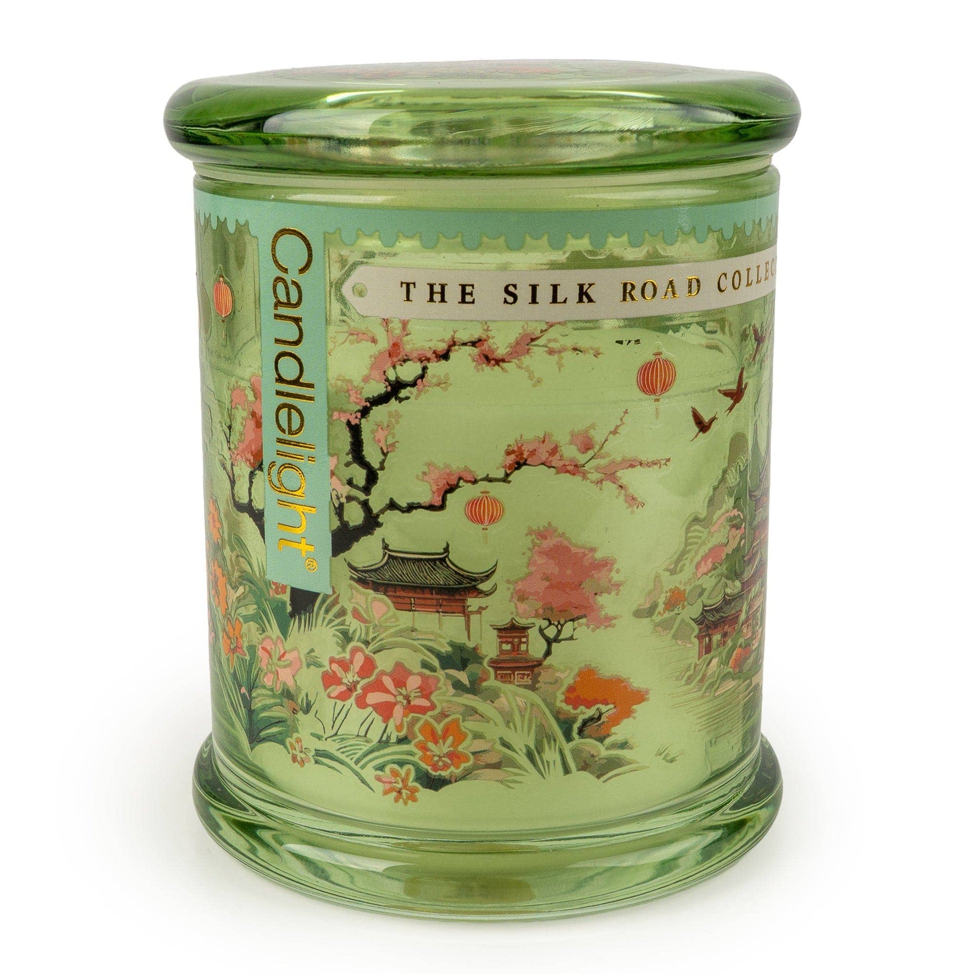 Inspired by serene spring gardens, the Large Glass Jar from our Silk Road Collection: Chengdu pairs a softly tinted green vessel with intricate artwork of cherry blossom, lanterns and temple pagodas. The generous wax fill delivers a long, even burn, while the matching glass lid helps protect the fragrance between uses and keeps dust at bay. Beautiful on a bedside, coffee table or bathroom shelf, it brings a calm, elegant glow to any room and makes a thoughtful gift for lovers of oriental-inspired décor. Once the candle is finished, reuse the lidded jar for trinkets, cotton pads or tea lights to enjoy its charm long after the last flicker. - Burn time approximately up to 28 hours